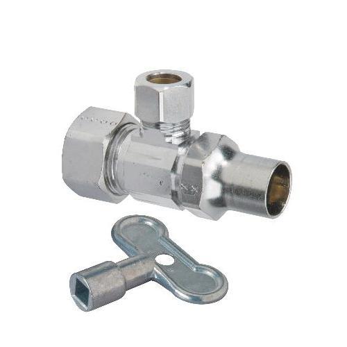 BrassCraft® 1/2 in nominal compression inlet x 3/8 in OD compression outlet multi-turn angle valve with lockshield and loose key controls water flow to household plumbing fixtures faucets, toilets, dishwashers, icemakers, washing machines and more. The angle valve is most often used where the water pipe enters the room from the wall. With a few turns of the key, you are able to stop or start the flow of water leading to the plumbing fixture, allowing for maintenance and repair without shutting-off the water to the entire home. Valve features lockshield with a loose key-to help protect against tampering and accidental activation.