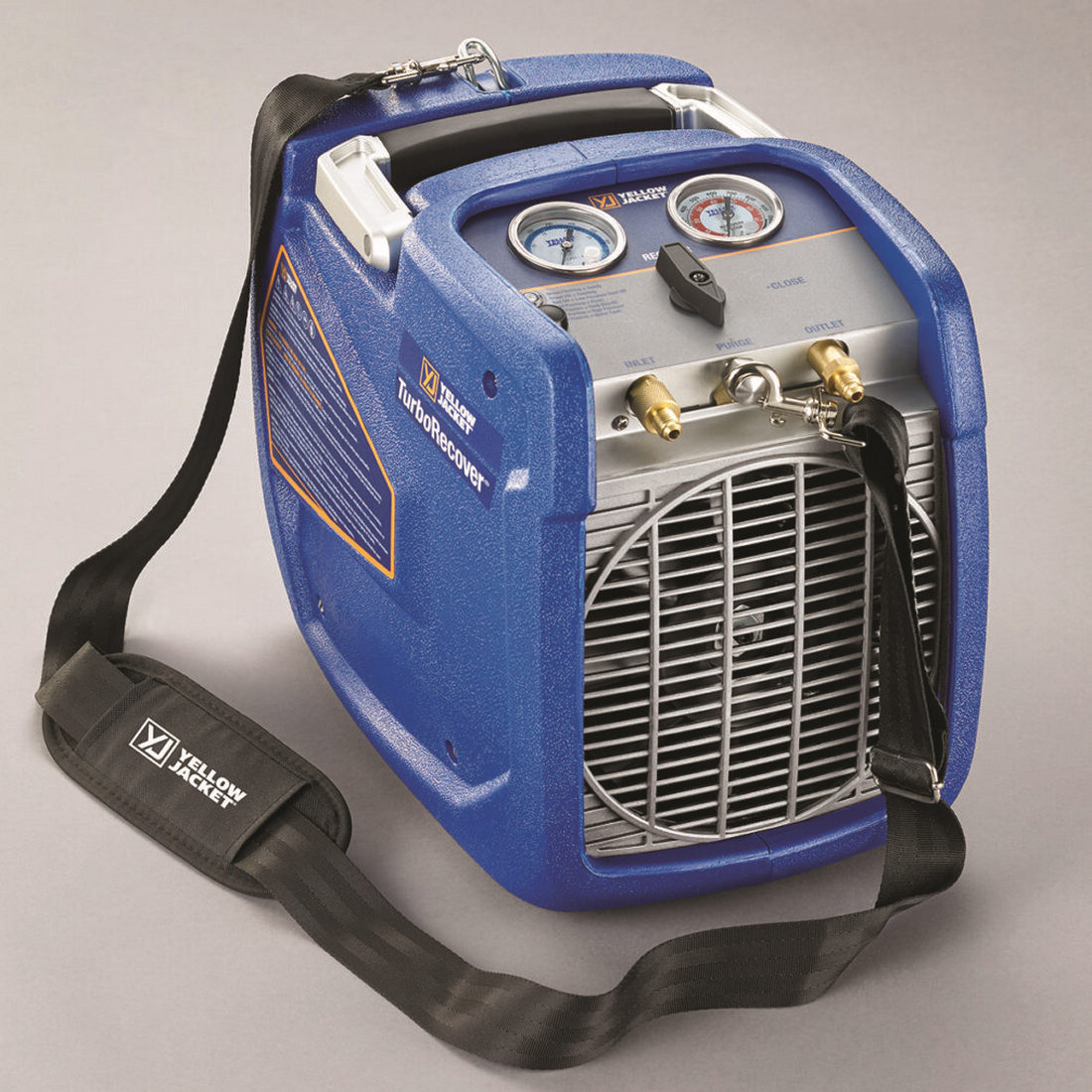 TurboRecover® for fast and effective refrigerant recovery.|The YELLOW JACKET® TurboRecover® has all the features you need for fast and effective refrigerant recovery. The powerful twin-cylinder, oil-less compressor and 1.25 hp Brushless DC (BLDC) motor ensure fast recovery of every system. Lightweight design and included shoulder strap allow for easy transportation to any jobsite. The single control valve and status indicator LED make it the simplest recovery machine on the market!|Dual-gauge design allows for monitoring of the system and tank pressures simultaneously and integrated low-pressure switch automatically powers down the machine when the system reaches 10" of vacuum. Integrated purge circuit clears residual refrigerant from the machine, preventing cross-contamination when changing from one refrigerant to another. The reusable mesh particulate filter is integrated into the suction port and can be easily cleaned or replaced. TurboRecover® includes all of these great features to make your job easy.