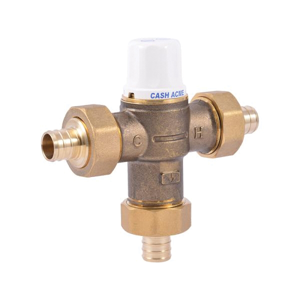 CashAcme™ Thermostatic Mixing Valve, 3/4 x 3/4 x 3/4 in Nominal, Barbed x Barbed x Barbed Connection, 145 psi, 0.34 to 11 gpm Flow Rate, 2-29/32 in Inlet to Outlet Length, Brass Body, EPDM Seal, 115 to 120 deg F, 4-15/16 in H x 5-19/64 in W