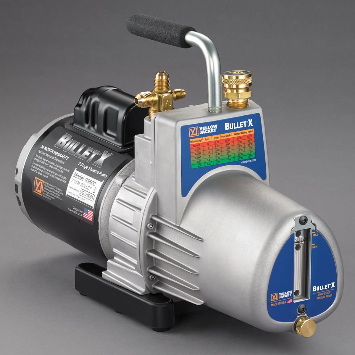 Wide mouth oil reservoir port for easier, cleaner filling. The YELLOW JACKET® BULLET®X vacuum pump is a two-stage rotary vane oil-sealed 7 cfm pump that pulls down to 25 um or better.