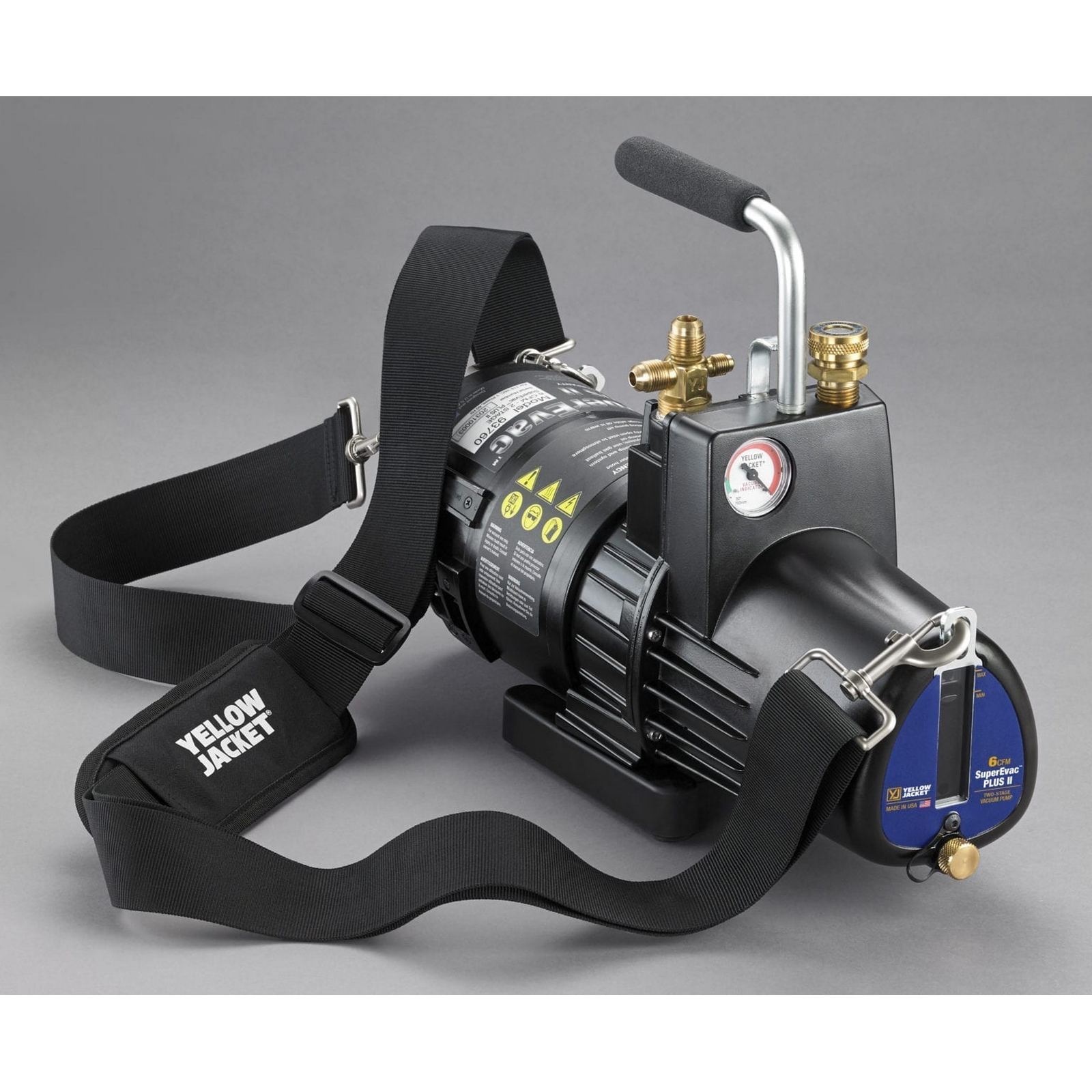 The brushless DC (BLDC) motor incorporated in the next generation YELLOW JACKET® SuperEvac® PLUS II vacuum pump provides key advantages over existing AC technology vacuum pumps. High-torque and high-efficiency define the ultimate performance in the most reliable vacuum pump. Able to function in extreme low voltage conditions and field rated to 15 um, the SuperEvac® PLUS II is always ready. The easy-to-carry, lightweight design.