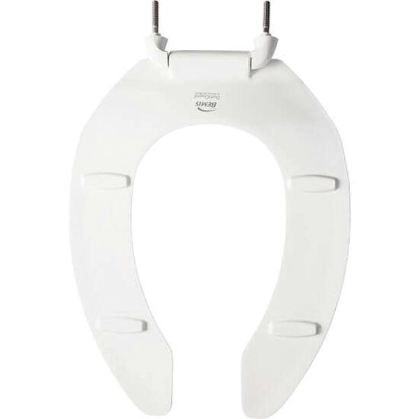 Bemis® Heavy-Duty Open Front Toilet Seat, Elongated Shape, Plastic, White, Commercial, 2.375 in H x 14.5 in W x 18.563 in D, Domestic/Import: Domestic