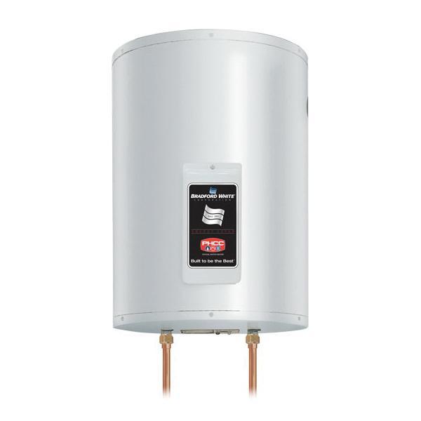 Bradford White® Residential Tank Electric Water Heater, 6 gal Capacity, 7 gph Flow Rate, 1 Elements, 1500 W Element Wattage, 120 V, 1 ph Phase, NPT Connection, 3/4 in Connection, 150 psi, Surface, Wall Hung Mounting, Fast Acting, Fully Automatic, Surface-Mounted Thermostat, Steel, 14 in Dia x 16-1/16 in H, Domestic/Import: Domestic, Screw-Type Immersion Element, Copper Element