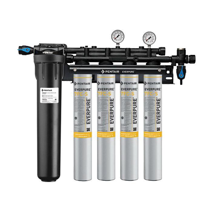 Everpure Insurice® Quad-Filter System, 3/4 in Connection, 100000 gal Capacity, 0.5 um, 10 gpm Flow Rate, Bacteriostatic, Chlorine, Cryptosporidium Cyst, Giardia Contamination Removal, 10 to 125 psi, 35 to 100 deg F, 25.59 in H x 29.36 in W x 6.75 in D