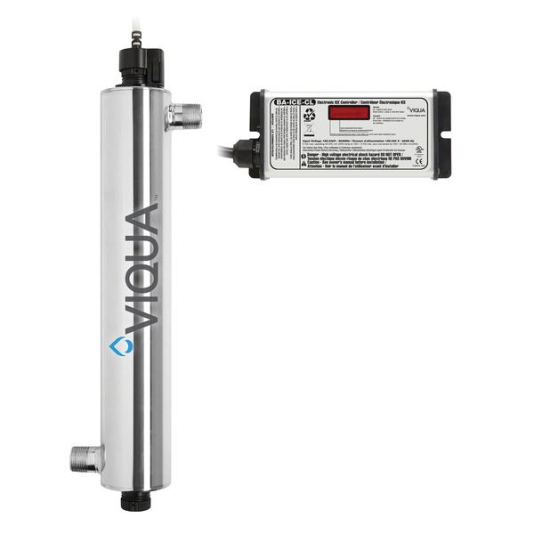 VIQUA™ Home UV System, 18 gpm Flow Rate, 5 um, MNPT Connection, Activated Carbon Filter Media, 15 to 125 psi, 3/4 in Inlet Pipe, 1 in Outlet Pipe, 100-240 V, 0.7 A, 60 W, 50/60 Hz, 304 Stainless Steel, 36 to 104 deg F, 23-1/2 x 3-1/2 in