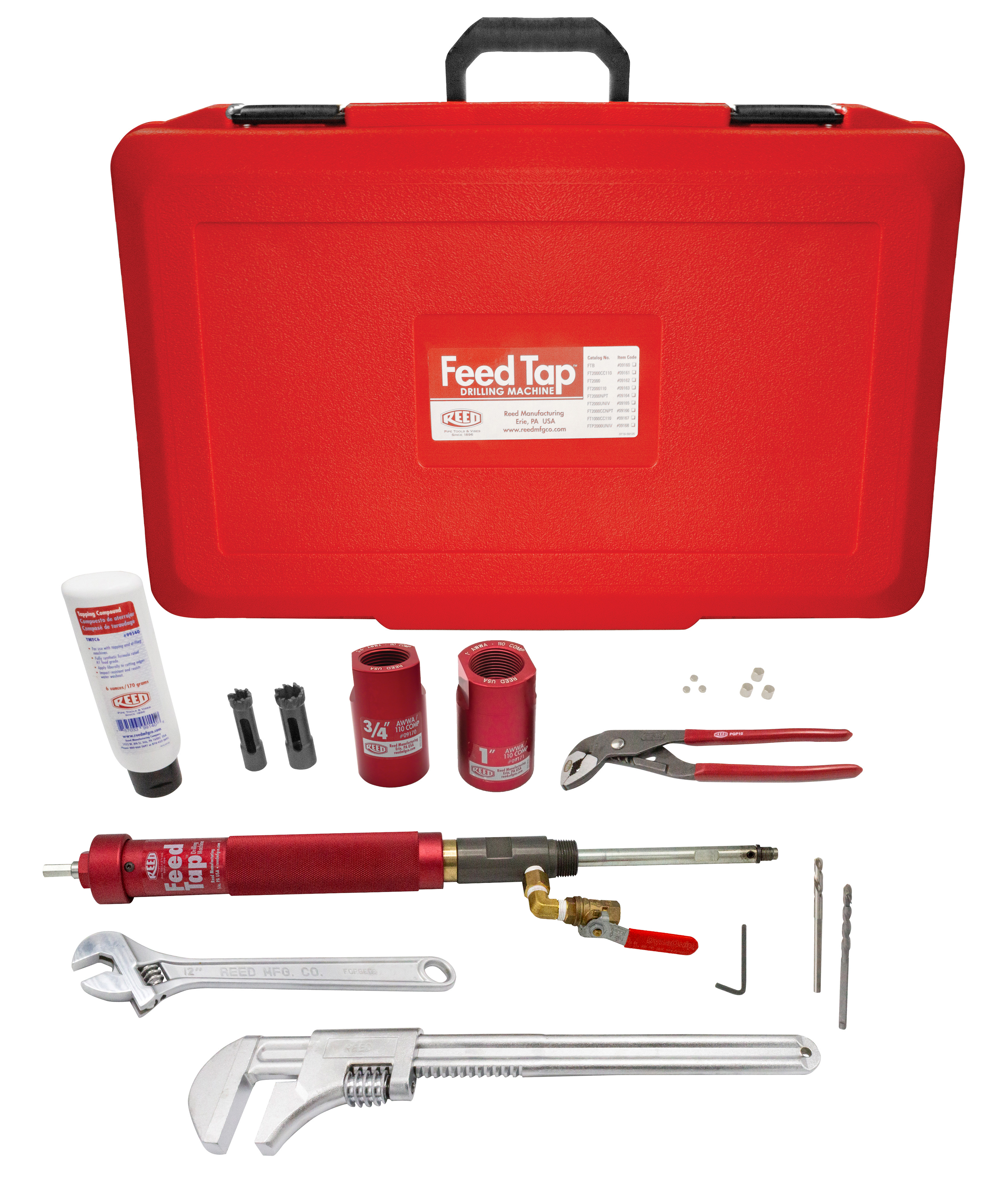 Feed Tap™ waterworks tool drills through PVC, PE, cast iron and ductile iron pipe while under pressure using a corporation stop inserted into a service saddle. Compact design with a separate, independent feed control allows the user to complete the tap using a drill (not included) for cast iron, ductile iron or PE. Manual power is required for use on PVC, CPVC and similar plastic pipe. The independent feed control advances the shell cutter for tapping PVC pipe as recommended by Uni-Bell PVC Pipe Association. FTB model Feed Tap consists of the base unit which allows the user to purchase shell cutters and corporation adapters separately, as needed. A complete kit for use with drill power is sold as FT2000UNIV. This kit contains both a coupon retaining drill bit CRPD25 and two sets of coupon retaining magnets. The magnets work well on ductile iron taps and the CRPD25 bit works on all types of pipe taps. The retaining method used is the choice of the individual operator. Designed for use on plastic pipe only, FTP2000UNIV relies on manual drilling operations using REED proven PVC/PE Shell Cutters. The FTP2000UNIV comes complete with all corporation adapters, shell cutters, shell cutter adapters, and a ratchet wrench with socket to cover 3/4" to 2" services in PVC and PE. Each machine ships with a sturdy carrying case. Note that HDPE can be tapped manually with PVC/PE Shell Cutters (PL series) or with a low speed drill and Heavy Duty Shell Cutters (FTSC series). Review the Feed Tap™ Operator's Manual to choose the model best-suited to the job.