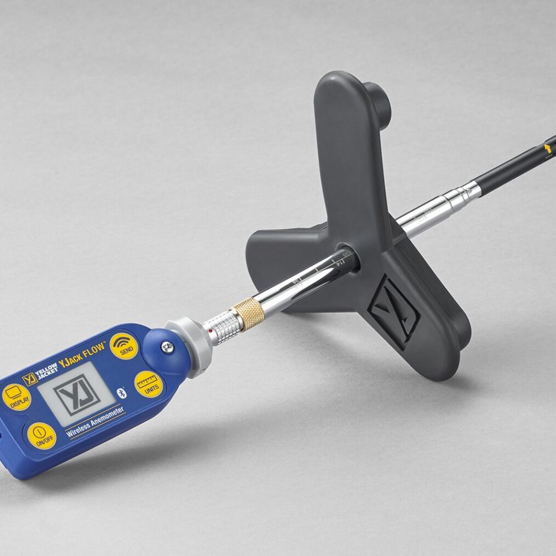 The YELLOW JACKET® YJACK FLOW™ measures and displays duct air speed readings and automatically calculates quantity and location of readings in ducts and meets AHRI standards. YJACK FLOW™ takes accurate air flow measurements up to 30 m/s, measuring the entire duct flow to account for turbulence or completes a single line air flow for fast duct to duct flow comparisons. Users may view system readings on the integrated display or view and analyze all system measurements with the YJACK VIEW® app 5.0, which includes the new Anemometer session to display the YJACK FLOW™ air volumetric measurements. The YJACK VIEW® app displays and stores the duct size, wand placement requirements and the data averaged to give you volumetric flow. Once all the system measurements have been captured, the reporting function saves the readings in a customizable PDF service report.