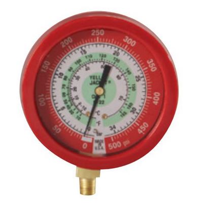 Yellow Jacket® Liquid-Filled Manifold Pressure Gauge, Connection Type: MNPT, 1/8 in Fitting, 1 % Accuracy, R-744 Refrigerant, 0 to 3000 psi, 0 to 210 bar Measuring, Red, 3-1/2 in Dia, 0 to 122 deg F, Additional Information: bar, psi, deg C, deg F Units of Measure